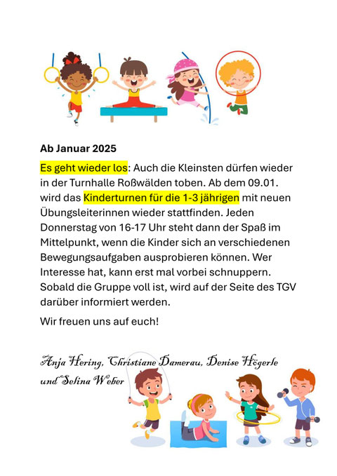 Insbesondere suchen wir auch Personen, die das Eltern-Kind- oder Vorschulturnen leitend übernehmen würden und sich für eineAus-oder Fortbildungs- Lizenz interessieren.